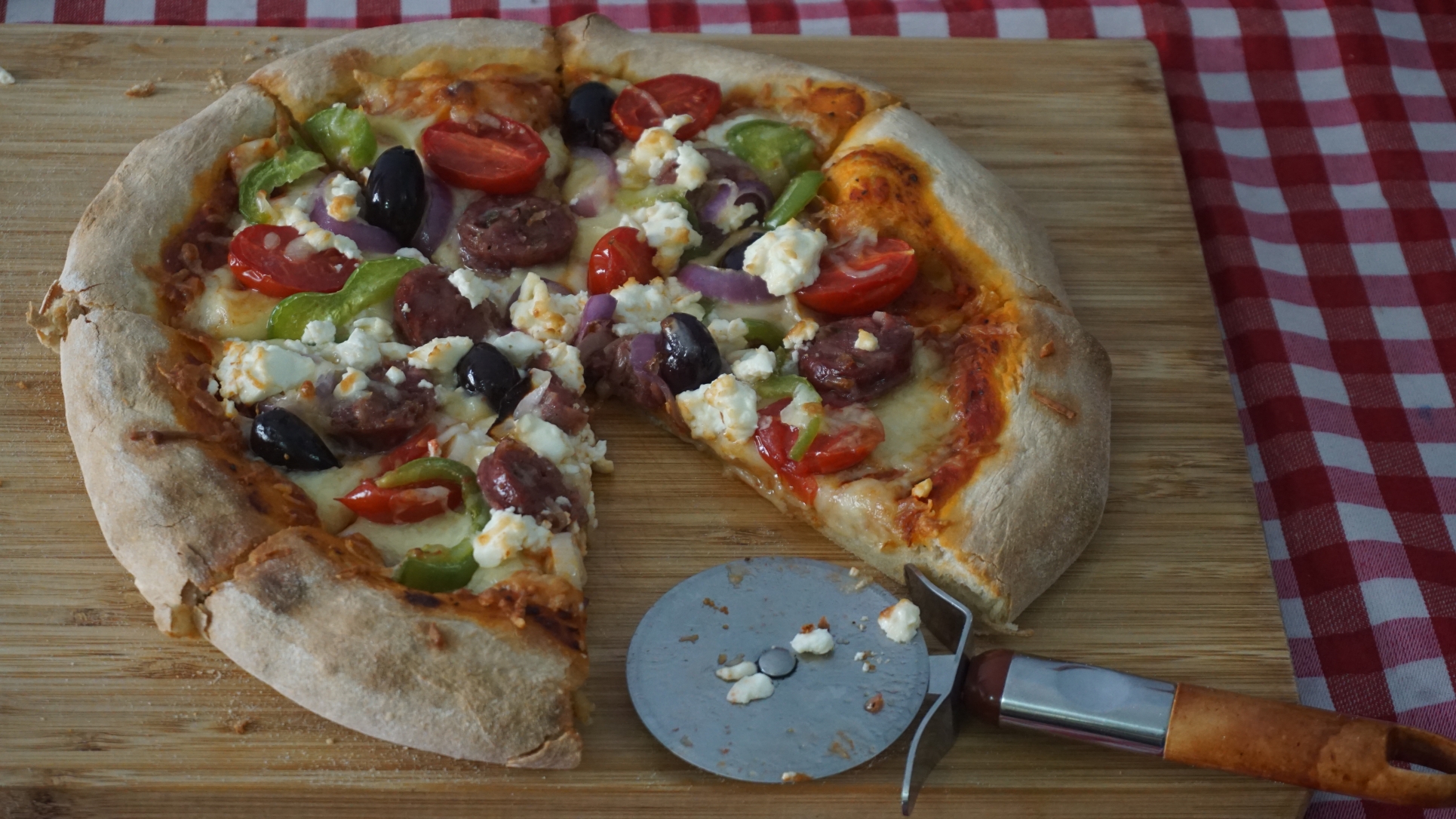 Πίτσα ελληνική με φέτα, ελιές, ντομάτα, χωριάτικο λουκάνικο, πεντανόστιμη και αφράτη. Φτιάξτε τη δική σας σπιτική πίτσα χρησιμοποιώντας αγνά και μερακλίδικα υλικά της ελληνικής κουζίνας! Με αφράτο ζυμάρι, φανταστική συνταγή για σπιτική πίτσα με ελληνικές γεύσεις!